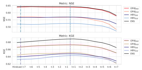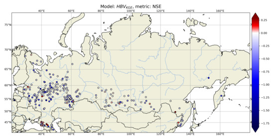 It was also expected that models that have been calibrated using particular metrics (either NSE or KGE) would have better results in terms of those metrics on the evaluation (hindcast period). Thus, and have higher median NSE efficiencies (0.71 and 0.64, respectively) than and (0.66 and 0.63, respectively) on the evaluation (hindcast) period. Obtained results raise a question of the best metric that could serve the needs of all interested parties: professional community, government agencies, and general public [49]. Currently, NSE and KGE metrics are popular only within the hydrological community. Hence, we need a targeted effort to make them (or more successful analogs) familiar to the general public.
