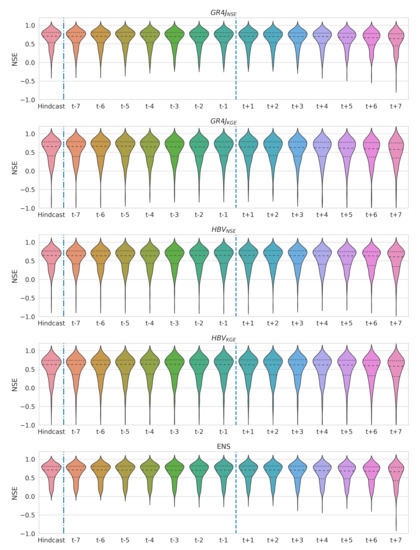 Figure 6 illustrates the distribution of individual and ensemble mean (ENS) model performances in terms of NSE for the hindcast period, as well as for seven pre-operational hindcast (… days) and seven forecast (… days) lead times for 252 OpenForecast gauges (see Figure A2 for the KGE metric). First, it is visually apparent that all models follow the same pattern of efficiency change: the efficiency slowly decreases with increasing lead time, and there are no significant drops between hindcast, pre-operational hindcast, and forecast periods. Thus, all models demonstrate persistent and robust behavior while assessed on a long-term period of almost two years (March 2020–October 2021). Both mean NSE and KGE (Figure 4 and Figure A1) are higher than behavioral values for all considered periods and lead times: 0.5 for NSE and 0.3 for KGE (after Knoben et al. [40]). The obtained results are in line with the previous large-scale assessments of the OpenForecast performance [20,50] that capitalizes on the robustness and reliability of the developed forecasting system.
