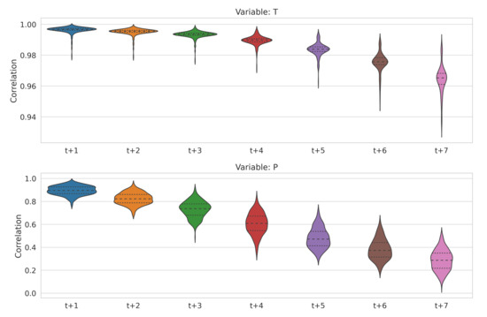 Results show that while numerical weather prediction made a huge step towards increasing efficiency of weather forecasts in recent decades [61], the chaotic nature of precipitation-related processes remains the main (unsolved) problem. It is clear that the efficiency of air temperature forecasting is solid and highly reliable—the lowest correlation coefficient is around 0.93 with the lowest mean value of 0.96 for a lead time of one week (Figure 9, top panel). In contrast, the mean correlation coefficient for precipitation decreases from 0.9 to 0.29 for the lead times of and days, respectively (Figure 9, bottom panel). However, due to a crucial role of transformation processes of water flow on a watershed (e.g., water travel time, basin memory), that distinct decrease in precipitation forecast efficiency does not directly transfer to a similar decrease in runoff forecast efficiency. Recent studies show [62,63] that modern deep learning techniques have ample potential to set new state-of-the-art results in the field of precipitation forecasting. Until then, OpenForecast may increase the number of meteorological forecasting products (apart from sole ICON) used in the system’s computational core to provide a wider range of ensemble forecasts.