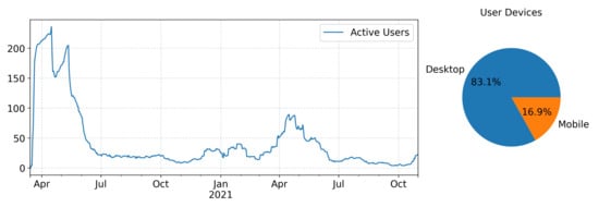 In contrast to weather forecasts, runoff forecasts have limited temporal and spatial demand. Floods typically occur in known flood-rich periods and should be impact-relevant, i.e., affect population and material property in river valleys, to be a problem for local communities. Thus, many people do not even require any flood forecasts, which cannot be said about the weather forecasts. Figure 10 illustrates OpenForecast daily users and devices they use to access the forecasting system website (https://openforecast.github.io, accessed on 22 December 2021).