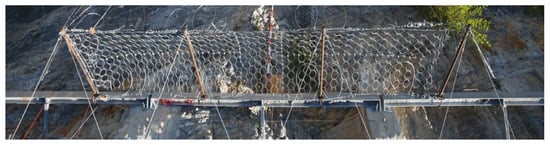 The present study was partly supported by the C2ROP programme (https://www.c2rop.fr/, accessed on 4 February 2022), a French national project that seeks both to bring together stakeholders in the field of rockfall risks and to create a platform of operational resources, in particular through two experimental campaigns carried out in 2016 and 2019, which are abundantly detailed in Olmedo, I et al. [19]. The experimental analyses conducted here are based on the data collected from these campaigns, which consist of 1:1 scale tests of block drops on a rockfall barrier described below (see set-up photo in Figure 1).