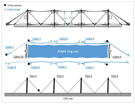 Architecture of the experimental flexible-barrier. Top: Technical drawing from above of the barrier by courtesy of the NGE Foundation. Middle: Decomposition of the supporting cable and of their weaving with the ASM4 ring net. The circle at the cables end represent the brakes (“snake” brake provided by the NGE Foundation), and the black square represents the force sensors. Bottom: Supporting structures made of post and struts.
