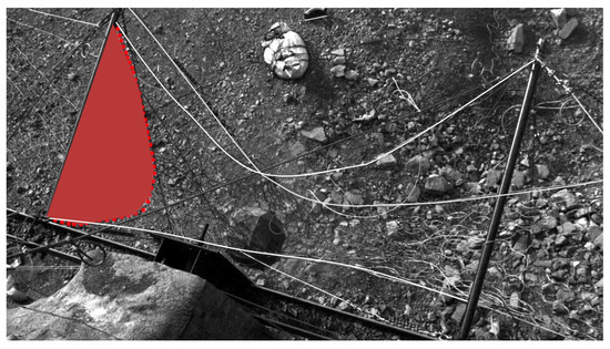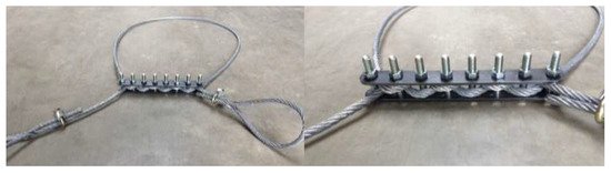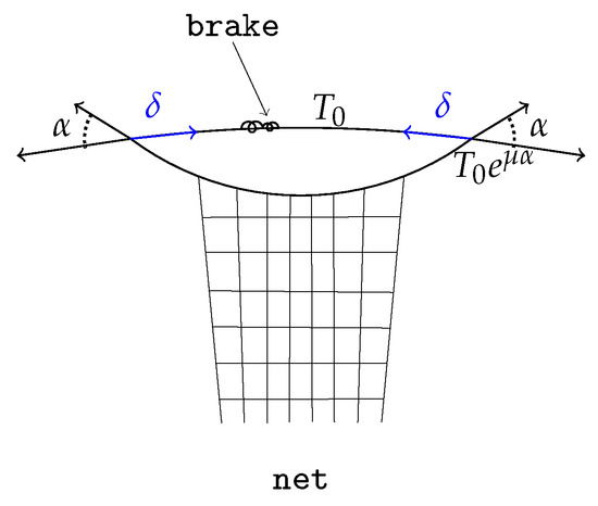 The barrier works as follows: a block is intercepted by the net, which deforms. The net slides along the edge cables (Boulaud et al. [20]), which deform. When the stress in these cables reaches a threshold force , friction brakes (called a “snake brake” by the provider NGE Foundation—they are shown in Figure 3) activate. In practice, the stress in the edge cables is not uniform, and one cannot foresee which end will be the most solicited. Therefore, one brake is set at each end for all the cables, except the lateral cables 9 and 10, which form a closed loop and require thus only one brake. The block stops finally when all the kinetic energy is dissipated.