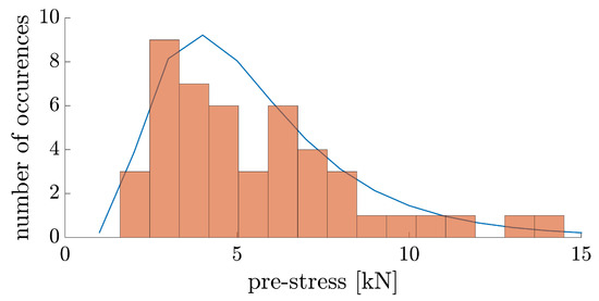 During these two test campaigns, 47 prestress values were thus measured thanks to an arbalest with an accuracy of ±2% [21]. To establish a distribution law for the prestress, it is necessary to ensure independence between values. However, the barrier consists in an hyperstatic structure, with a relatively high level of hyperstaticity: when one pulls on one cable, the tensions in the others vary. It is therefore preferable to take the pre-stress values for each cable individually from each test (these values are indeed independent), to identify for each cable the distribution law characteristics (through the various experiments). Then, from the identified prestress distributions, one can determine an average distribution law, which is shown in Figure 5 with the characteristics displayed in Table 3.