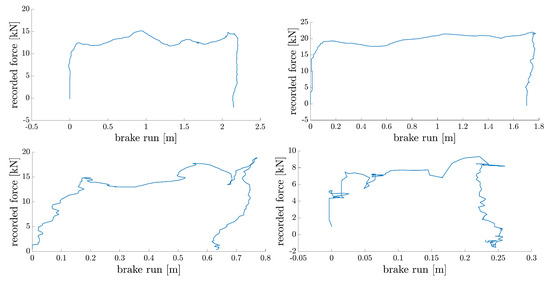 In the same way, during these two campaigns, 27 usable brake-activation threshold values were identified. The force values were obtained directly from the force sensor data whose location is indicated in Figure 2. To obtain the complete force/displacement curve, digital image correlation was used to measure the distance between brake anchor points on images from the high-speed camera. The time correlation was made manually by combining the force/time curve and the elongation/time curve. Usable data of the brake threshold were then found when data were available from three sources: data from the force sensor, visibility of the brake on the high-speed camera images, and data of the prestressing force. Four typical force–displacement diagrams are displayed in Figure 6. These values are all independent.