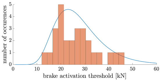 The brake threshold distribution in Figure 7 with the characteristics displayed in Table 4 was determined from these values. A log-normal distribution of parameters and was defined.