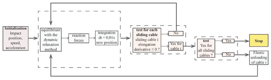 The starting point of the numerical model is a code that was already used for the rockfall barrier in two previous publications by the authors [16,20] and which is therefore not recalled here. This tool is based on quasi-static calculations conducted by the dynamic relaxation method (Day [22]), an algorithm which is suited for the study of static equilibrium of structures with large displacements (Douthe and Baverel [23]).