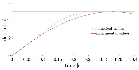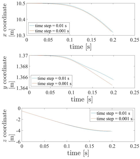 The determination of the time step was done through a convergence study for an off-centred impact at . Considering a time step of 0.01 s and comparing it to a time step 10 times smaller, the difference in the calculation of the new positions was, at most, less than 2% of the value (for the position according to z). The value s was therefore considered appropriate, as shown in Figure 9.
