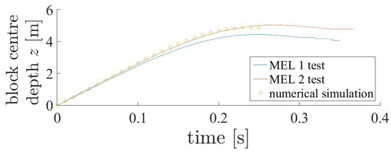 A few tests were performed to compare the accuracy of the model over time with the experimental data. The block trajectory for the MEL test is shown in Figure 10. The numerical solution fits the MEL 2 trajectory. Qualitatively, the dropping profile is the same. Quantitatively, the comparison was difficult because of the variability between the MEL 1 and MEL 2 tests. However, it can be concluded that the model reproduces reality quite well.