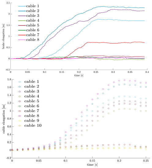 Adding this adjustment to the cable behaviour of the side cables reduces the total brake elongation of cable 9 by 60%. The difference between numerical and experimental elongation becomes hence comparable to other cables and can be attributed to the discrepancy of threshold values (whose influence is discussed in the next section).