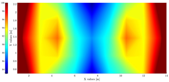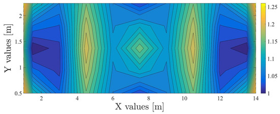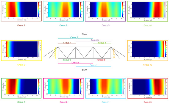 As expected, the residual height was greater in the most rigid areas (i.e., where the net deforms less). However, there was a local maximum for the centred impact. This can be explained by the symmetry of the system: the cables on each side are less stressed at one time and therefore deform less plastically, while for the off-centre impact in y, the cables on one side are very stressed and deform strongly and then, when they unload, do not regain their initial length since in the plastic domain. This effect does not occur in the centre of the side nets: at this location, the length of the cable’s attachment to the net is much shorter (cables 4, 5, 6, and 7) than the for dissipating cables of the centred impact (cables 1, 2, 3, and 8). They can therefore stretch less in the plane (x, z) and deform more in the plane (y, z). This results in a lower residual height (i.e., a higher proximity of the opposite edge cables).