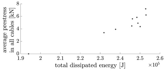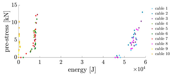About ten numerical simulations were performed, the results of which are presented in Figure 21 and Figure 22. Figure 21 illustrates the variation in the amount of energy dissipated by a cable for different prestress values applied to this cable in the case of a centred test. It appears that the increase in the prestress of a cable has almost no influence on the amount of plastic energy dissipated by this cable (dots are almost vertically aligned). Indeed, during the impact, the cables rearranged, and the final equilibrium was the same. However, for cables with very low prestressing (typically below 3 kN), the amount of energy dissipated for these cable decreased significantly. Considering that the cable stiffness under lateral load at the time of impact was directly linked with their geometric stiffness: the higher the initial prestress, the higher the cable stiffness. Considering then that the structure is hyperstatic, it is well-known that, in hyperstatic structures, stiffness attracts forces. It seems thus natural that when the structure is unequally prestressed, forces should be attracted by the most prestressed cables, resulting in some small variations in load paths through the net, which has time to deform significantly before tensions in the less prestressed cables reach the threshold value and start dissipating energy.