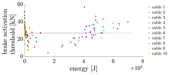 The local study of the influence of the threshold is shown in Figure 23, where for each cable, the energy dissipated by this cable is represented as a function of the brake-activation threshold whose value was given by the manufacturer as 25 kN. As expected, one observes that the dissipated energy is almost proportional to the brake threshold. Variations in the dissipated energy are significant, and, for example, in the test sample, the energy dissipated by cable 8 varied from 1.70 kJ (when the threshold was 5 kN) to 5.2 kJ (for the threshold of 42 kN).