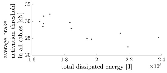 Globally, Figure 24 represents the average of the thresholds for a simulation as a function of the total energy dissipated during the impact. Here, it can be seen that the higher the average brake activation threshold, the less dissipation there is, and vice versa: that is, when all the brakes are triggered later, the amount of energy dissipated is lower. Considering that the global deformation increases with time and, by there, that the strain energy increases with time, one might suppose that the later the triggering of the brakes, the higher the share of elastic strain energy (or equivalently the smaller the dissipated energy). Moreover, as the barrier deforms, the cables incline, and the vertical component of the braking forces increase: the more vertical the braking force, the more efficient the dissipation. The dissipation being more effective, the dissipation needs are also reduced.