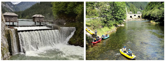 The case is built around a group of students from Vienna that go for a rafting and kayaking weekend. The location chosen is the pristine Salza river, an eastern tributary of the Enns river, that is a popular spot for water sports (rafting, kayaking, etc.). Most water sport activities start downstream of the Prescenyklause (Figure 3) that was constructed in 1848 as a small dam for a saw mill. In the 1980s, the Prescenyklause was re-adapted as a hydropower plant with approximately 1.5 MW of power [22].