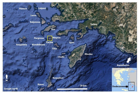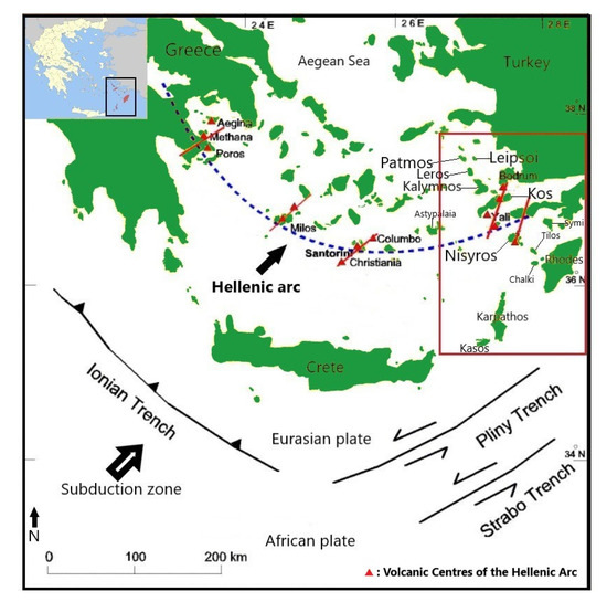 Nisyros Island is the youngest volcano of the South Aegean Active Volcanic Arc, which resulted from the subduction of the Eastern Mediterranean lithosphere beneath the active Hellenic margin of the European plate. It is part of the Kos–Yali–Nisyros Volcanic Field, which is located on the easternmost edge of the South Aegean volcanic island arc. (Figure 1 and Figure 2) [43].