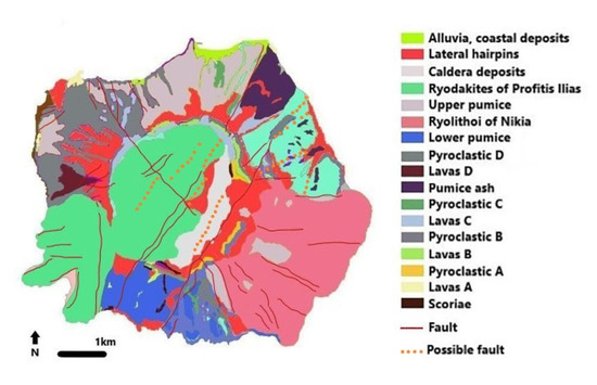 The recent form of the caldera is a well-defined circular topographic feature with a diameter of 4 km, with a presently flat caldera floor intercepted by phreatic craters with cliffs of up to 300 m [43]. The top of the Profitis Ilias (Figure 4) post-caldera dome is the highest point (698 m) [44,47,48,49,50]. The exposed stratigraphy has an age of −160,000 years [49], and the most recent phreatic eruption occurred in 1867 A.D. [51].