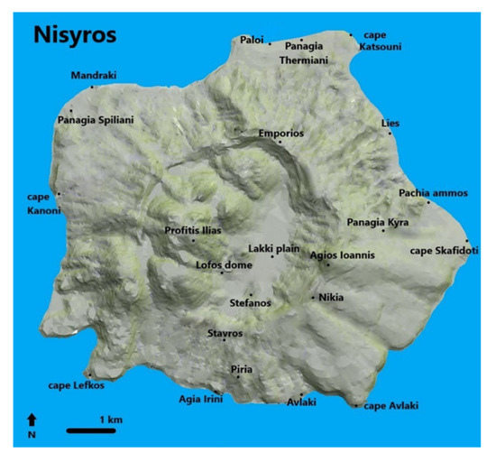 3D representation of the surface of Nisyros Island, indicating the location of places referred in the text [52], modified.