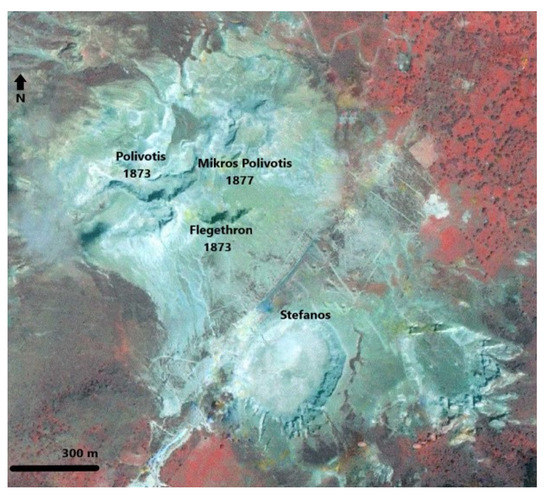 The caldera hosts a well-known hydrothermal-fumarolic field, whose hydrothermal activity is expressed on the surface by a network of intersecting hydrothermal craters, located in the southern part of the Lakki plain (Figure 4). These craters are governed by diffuse degassing structures. [44,53,54,55,56,57]. The most well-known hydrothermal craters are: Stefanos, Phlegethon, Megalos Polyvotis, and Mikros Polyvotis (Figure 5). [44,53]. The volcano’s last crater, “Mikros Polyvotis”, was formed in 1887, following the volcano’s last—so far—hydrothermal explosion.