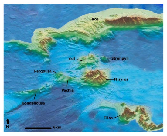 The major distinction in Nisyros’ volcanic history is the first period of stratovolcano formation, which ended with a major eruption (Nikia rhyolites) and caldera formation, followed by the second period of volcanic dome formation, which disrupted the former caldera rim (now observed at about 300 m of elevation) and formed the highest actual mountain of Prophitis Ilias (698 m). Recent volcanic formations in the submarine area around Nisyros have created the volcanic centers of Pergousa, Yali, Strongyli, Pachia, and Kondeliousa (Figure 6) [61,62].