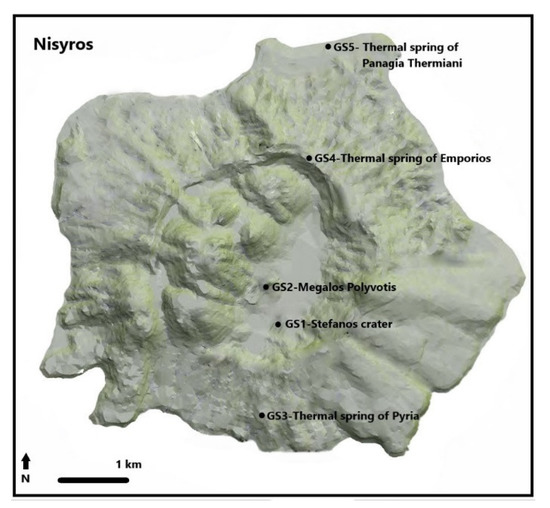 3D representation of Nisyros Island, indicating the location of the studied geosites [57], modified.