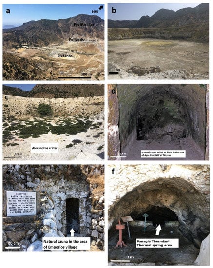 Geosites of Nisyros Island: (a) the Stefanos and Polyvotis craters, (b) the Stefanos crater, (c) the Alexandros crater, (d) the Piria hot spring, (e) natural hot spring of Emporios, and (f) Panagia Thermiani thermal spring.