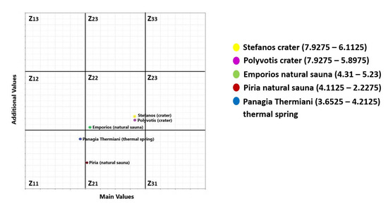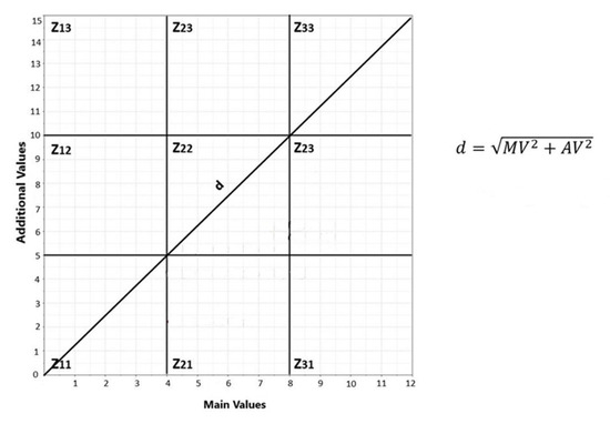 The final results coming out from this method are depicted in a diagram, where the 12 categories studied in the main values are placed on the vertical axis, while the 15 categories of additional values are placed on the horizontal axis. Furthermore, this diagram is divided into 9 fields, which are as follows: starting from the beginning of the axes and referring to the x-axis in the fields Z11, Z21, and Z31; moving up to the y-axis in the fields Z12, Z22, Z23; and finally, the fields Z13, Z23, and Z33. Each study area’s final score is represented by the diagram.