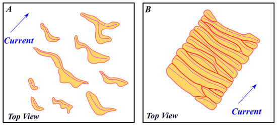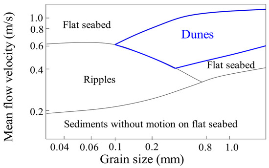 Underwater dunes (henceforward dunes) are the result of sediment transportation through time by a flow. In fact, there is a correlation between the grain size of the sediments and the flow velocity in the resulting sedimentary structure formed on the seafloor (Figure 1). The dune migration and shape are correlated to its nature and to hydrodynamic factors [4,20,21,22,23].