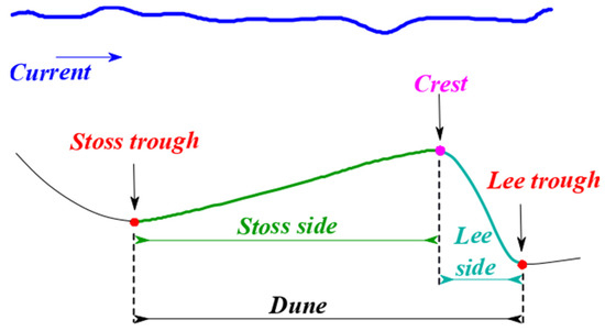 Figure 1 shows that dunes are formed with grain size ranging from gravel to fine sand (i.e., grain size greater than 0.1 mm up to more than 1.0 mm). Dunes are limited in finer sediments, such as silt or very fine sand [4]. According to the dunes classification proposed by the author of [24], dunes have a height ranging from 0.075 m up to 5 m and spacing from 0.6 m to more than 100 m. The height and spacing of dunes usually increase with the flow velocity [8,25]. These and other morphological descriptors shall be further described in the paper. Dunes have a gentle slope facing the current and a steep slope in its direction. A crest line separates these two slope sides, which are bounded by its troughs. The gentle slope is defined as the stoss side and is bounded by the crest line and the stoss trough. The steep slope of the dune is defined as the lee side and is bounded by the crest line and the lee trough. The lee side of the dune indicates the migration direction of this structure. The stoss and lee sides of the dunes are adjacent to each other [1,17,23,26]. Figure 2 illustrates a representation of this sedimentary structure and its related features.