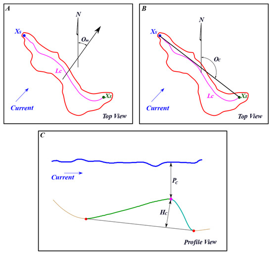 Starting with the crest line, its length can be estimated considering its starting and ending points. Furthermore, these points are used to assess the dune orientation angle. This angle can be estimated in two different ways. The first is the dune migration direction relative to the north, as proposed by the authors of [28], illustrated in Figure 4A. The second is the direction of the line passing through the starting and ending point of the crest line of the dune, illustrated in Figure 4B. This second orientation angle is usually perpendicular to the main direction of the current, although angular variations up to 20° can be observed [29,30,31]. The depth corresponds to the distance between the crest line and the water surface. This measure can be estimated based on the depth values of the crest line that can be found on its corresponding pixels in the DBM. In addition, the height of the dunes can be measured as the shortest distance between a crest line and a line joining both troughs [27]. Figure 4 illustrates the descriptors associated with the crest line.