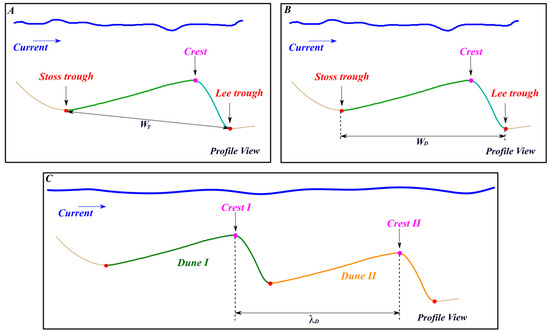 Width and spacing of the dunes. In (A), the width is represented by the distance between the dune stoss and lee troughs (WT). In (B), the width is represented by the horizontal distance between the dune lee and stoss troughs (WD). In (C), the width is represented by the spacing measured between two consecutive dunes at their crest lines (λD).