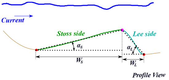 Dunes can also be characterized by different index values, which are calculated based on the dune measurements previously described. The dune symmetry index (1) is defined as the ratio between the stoss and lee side widths [18,26,32].