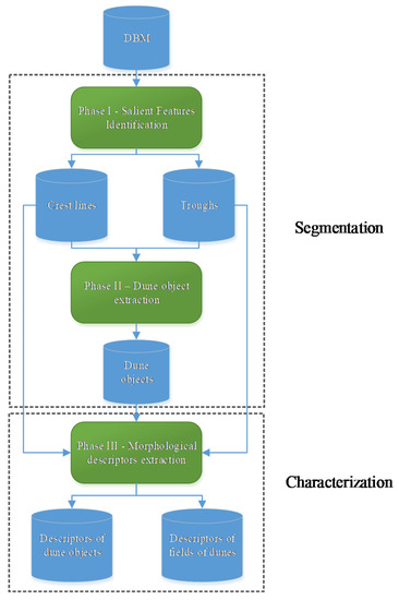 This section aims to describe the proposed automatic method to extract the morphological descriptors of the dunes from the seafloor. Our method is divided into two main processes: dune segmentation and dune characterization. This method considers the seafloor surface modelled by a regular gridded DBM. The processes and phases of our method are illustrated in Figure 8.