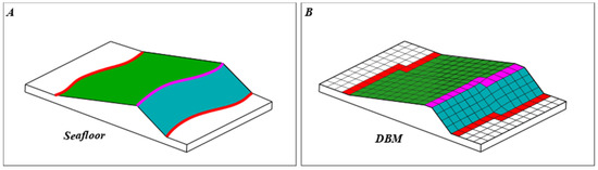 The dune object identified using its salient features and components. In (A), the dune object on the seafloor is schematized. In (B), the dune object is schematized as identified on the DBM grid. The crest line is in magenta, the trough lines are in red, the stoss sides are displayed in green, and the lee sides are displayed in blue.