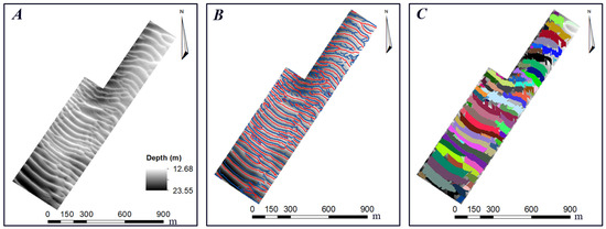 Data and results for the dune segmentation approach proposed by [17] for the sector G14 of the Northern Traverse. (A,B) illustrate, respectively, the DBM and the salient features of the dunes identified in Phase I; the crest lines are displayed in red and the troughs in blue. In (C), the dune objects segmented in Phase II are presented. Please note that each segmented dune illustrated in (C) are represented with a different color.