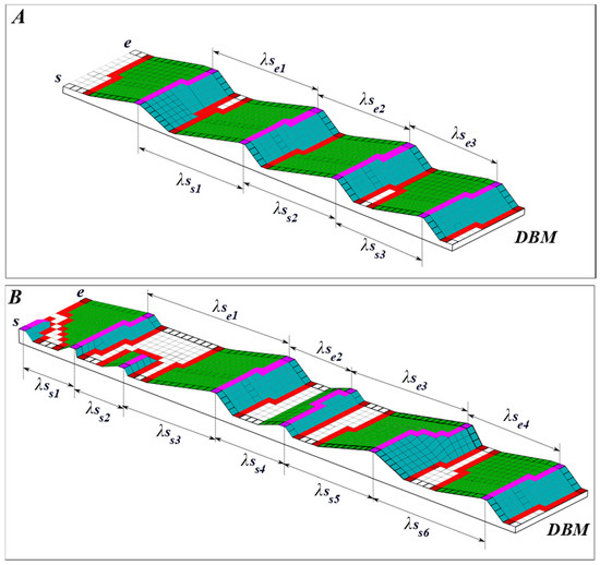 Figure 12. Spacing between the crest lines of two consecutive dune objects. The crest lines are in magenta, the trough lines are in red, the stoss sides are displayed in green, and the lee sides are displayed in blue. λS represents the spacing between dunes while and represents, respectively, the starting and ending point of the crest lines. (A) presents adjacent dunes in a field and (B) presents isolated dunes on a field. The dunes in A are more equally spaced than in (B), considering the spacing (λS) between these objects calculated for each pixel of the crest lines. - The standard deviation of the spacing () is computed considering all the spacing values of the dunes on a field. This descriptor is useful to characterize the dunes dispersion on the seafloor surface.