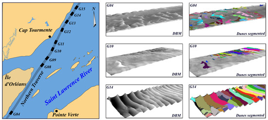 The Northern Traverse is divided into different sectors. In this paper, nine sectors of the navigation channel are considered with 17 DBMs. Consequently, some sectors have more than one DBM (namely sectors G04, G09, G10, G11, and G14). The DBMs considered in the same sector were acquired at different dates, with a time lapse ranging over a few days to a few years. Even if the DBMs are in the same sector, the sedimentary structures on the surface are different due to the high dynamism of the Saint Lawrence River in the studied zone. In total, 1234 dunes were segmented from the 17 considered surfaces, using the approach proposed by the authors of [17]. This segmentation approach has proven to be efficient with a performance rate of 92% of well-segmented dunes (i.e., true positive). Figure 13 illustrates the location of the different sectors of the Northern Traverse considered in this analysis. It also presents examples of DBMs and segmented dunes for different sectors.