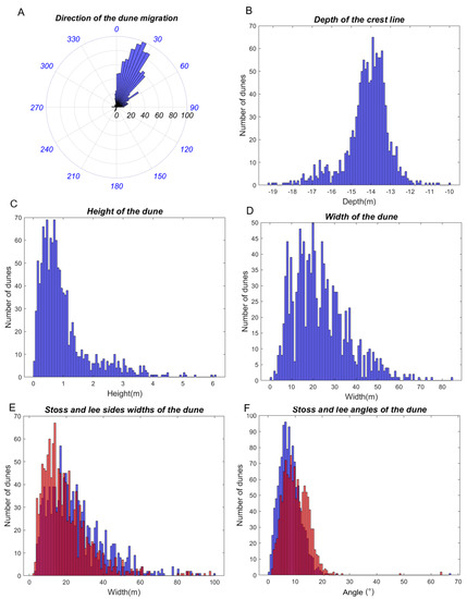 Histograms of the morphological descriptor values. Please note that in (A–D) the descriptors of the dunes are in blue. In (E,F), the stoss descriptors are in blue and the lee descriptors are in red. The additional color (i.e., orange) results from the superposition of the red and blue colors.
