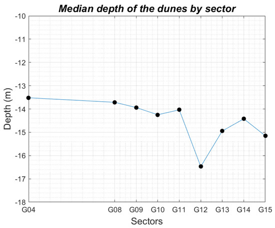 The Northern Traverse being a navigation channel, the depth of the dunes is an important morphological descriptor of these sedimentary structures. Figure 16 presents the median value of this descriptor for each sector of the Northern Traverse. The sectors are ordered sequentially on the x-axis in accordance with their spatial arrangement in the North Traverse (i.e., G04 is the southernmost sector and G15 the northernmost sector). Moreover, consecutive sectors are equally spaced on the x-axis.