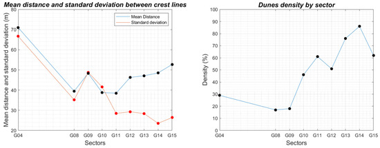 Figure 17 shows the height and width of the dunes are correlated. Indeed, the highest dunes are in the same sector as the widest dunes, and the narrowest dunes are in the same sector as the smallest dunes. The descriptors of the dunes fields (i.e., λS, , ) are illustrated in Figure 18.