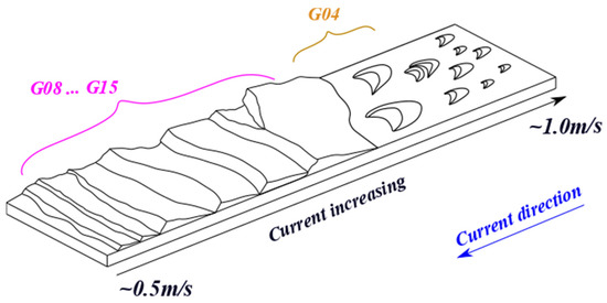 Even if Figure 19 is an approximation in terms of current and dune sizes, it is possible to position the sectors of the Northern Traverse based on the dune field descriptor values (cf. Figure 17 and Figure 18). It could be assumed that the flow current increases from sector G08 to sector G15 since dunes in sectors G08 to G12 are smaller than dunes in sectors G13, G14, and G15. The isolated dune objects of the southernmost sector (i.e., G04) may result in a stronger flow current than the sectors located to its north.