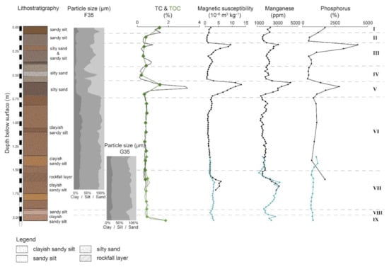 Sedimentological and geochemical properties of the profile F35 (black graphs) and G35 (grey graphs): carbon content with TC and TOC (green graph); magnetic susceptibility, element trends (manganese and phosphorus) (mod. [1]).