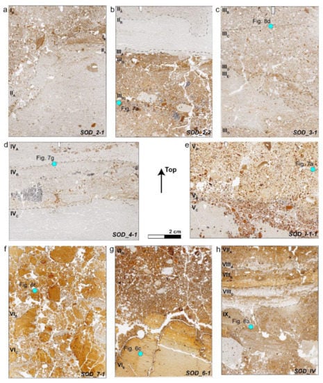 The geogenic Unit VIII, approximately three cm thick, has a complex structure with a sequence of three thin subunits, which are preserved in thin section SOD_III and particularly well in SOD_IV. In these subunits, the coarse components consist of volcanic glass particles in different states of weathering. The lowest subunit (VIIIC) appears very loose with large porosity and includes two white tephra layers with intermixed brownish-grey sediment. The layers are separated by a brownish silty layer containing only a few sharp-edged volcanic glass particles. The upper part of this subunit ends with a compacted crust of light pale clay, followed by a subunit (VIIIB) of yellowish tephra. The lower part consists almost entirely of weathered volcanic glass and yellowish clay coatings (textural pedofeature) (Figure 5h). The micromass of this subunit has a speckled limpidity and grano-, porostriated b-fabric. The uppermost subunit VIIIA is characterized by volcanic glass particles mixed in a brownish-grey matrix. The most prominent pedofeatures of this unit are yellowish clay coatings with bright interference colors.