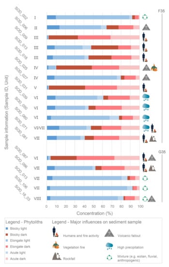 A total of 20 sediment samples were taken from two excavation squares F35 and G35 (Table A1), for the analysis of black carbon (BC) covering anthropogenic deposits, light-colored tephra, and the archaeologically sterile section. For the phytolith study, ca. 10 g of thirteen bulk sediment samples were collected from excavation squares F35, and seven samples were taken from G35. To determine AO extractable Fe, Si, Al, and Mn, 20 reference bulk sediment samples were selected from the stratigraphy.