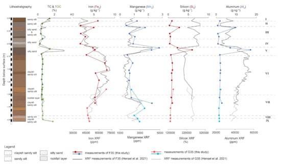 Comparison of new results of the oxalate extract of FeO, MnO, SiO and AlO (colored graphs) with the geochemical results from Hensel et al. [1]: carbon content (TC and TOC), total values of Fe, Mn and Al determined with a portable XRF and Si with XRF (black-grey graphs) (mod. [1]).