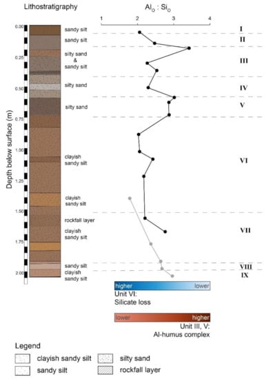 The content of FeO ranges from 1.77 g/kg to 8.15 g/kg with peaks in the cultural units (I, II, V) and the highest value in the sterile Unit VI (Table A3). The MnO values are lower compared to FeO, varying between 0.44 g/kg and 2.77 g/kg, with the highest values in the anthropogenic units (I, III, V, and VII). AlO has the highest values compared to all extracted oxides, with values ranging from 0.77 g/kg in the tephra (Unit II) to 17.07 g/kg in Unit V. The trend of SiO is similar to that of AlO, with values ranging from 0.31 to 5.96 g/kg. The highest values occur in Unit V. The ratio of AlO:SiO, which is an indicator for the presence of allophane content [51,52], varies between 2:1 (Unit I, VI) and 3:1 (Units II, V).