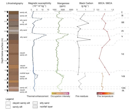 According to macroscopic observations in the field, the deposits are slightly tilted to the northern backwall of the shelter. The occupational layers are recognized by a mostly dark brownish sediment color with an average grain size of silt and fine sand. In addition, some layers of these units show sediment rubification. Cultural remains and structures include lithic obsidian artifacts, macroscopic charcoal, hearths, and pits. Bone material has not been preserved in layers older than some hundred years due to the moist and acidic milieus of the sediments. The cultural units have a certain sedimentological fingerprint, characterized by higher values of total organic carbon (TOC), magnetic susceptibility (MS), manganese (Mn), and phosphorus (P) (Figure 4) [1]. The presence of hearth features and the lateral distribution of macroscopic evidence for fire residue in Unit III and V [1] represent in situ burning events as known from other rockshelter sites [49].
