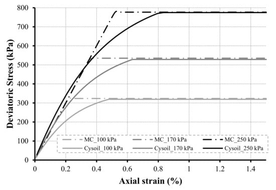 For other parameters that are necessary for the CYsoil model, they were obtained by calibrating with three numerical triaxial tests. The confinement stresses (σ3) of 100 kPa, 170 kPa, and 250 kPa were chosen to take into account the stress level at which the tunnel is excavated. The results of the calibration are showed in Table 1. The stress–strain curves obtained for the different values of σ3 are illustrated in Figure 1. To calibrate the initial modulus value (Table 1), the confining pressure σ3 equaling to 170 kPa in the center of the tunnel (20 m deep) has been chosen.