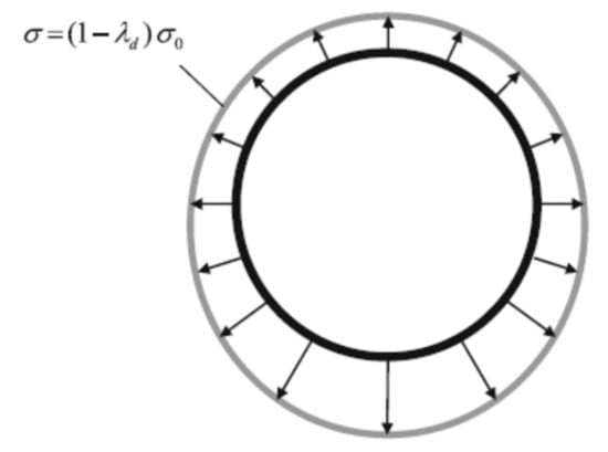 - Phase 1: Stress release phase. The excavated soil inside the tunnel is deactivated and a radial pressure to the tunnel wall is applied. The value of this pressure is done by using Equation (10). This pressure is not constant over the circumference of the tunnel and depends on the initial stresses state (Figure 3).where λd: the stress relaxation ratio; σ0: the initial soil stresses (kN/m2); σ: the applied radial pressure (kN/m2). A gradual reduction of this radial pressure is applied to the excavation circumference until its value reaches the specified stress relaxation λd. In this study, the coefficient λd is taken equal to 0.65. This value was obtained by a previous analysis in 3D calculations by [].σ = (1 − λd) σ0