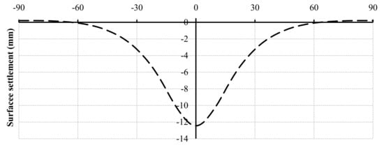 Figure 4 illustrates the vertical movements at the ground surface from a deterministic analysis. At the tunnel center, the settlement values increase, with a maximum value located above the tunnel center, due to the conditions of symmetry. Then, far from the center of the tunnel, the settlement decreases.